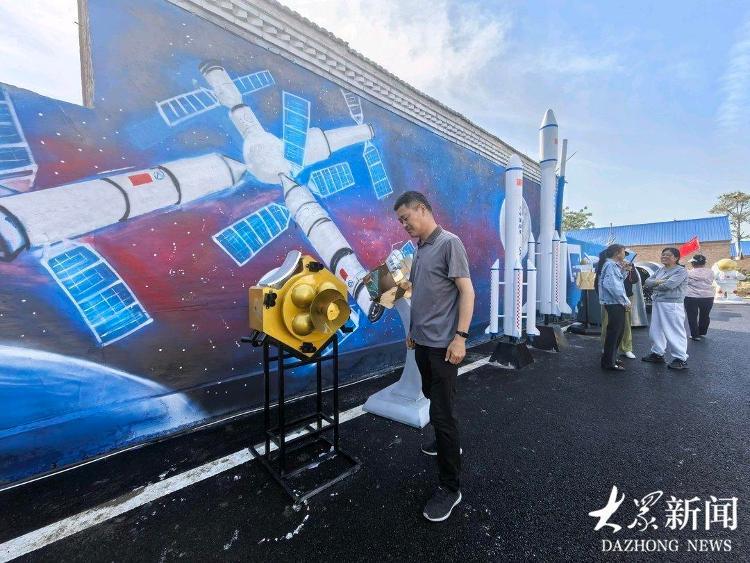 曹州墙绘师刘晓白专门来到回楼村,用了两天多时间,为村里广场的房前屋侧喷绘了火箭发射、天宫一号、宇航员等图案,他称之为“梦想星空”。村广场上还设置了火箭、天宫和宇航员模型等,打造出逐梦太空的科幻场面。