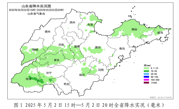 据山东省气象台消息,今天(5月2日)15时至20时的5个小时里,全省共有12市、51县(区市)、634乡镇出现降水,平均降水量0.4(毫米,下同),折合水量约0.6亿立方米。各市平均:菏泽2.4和济宁1.4.其他市降水量不足1.0或无降水。所有站点超过10.0的有17个站,5.0—10.0的29个,1.0—5.0的149个,降水量前3位的是:济宁金乡淳集23.2、菏泽巨野章缝22.4和菏泽巨野营里18.6。