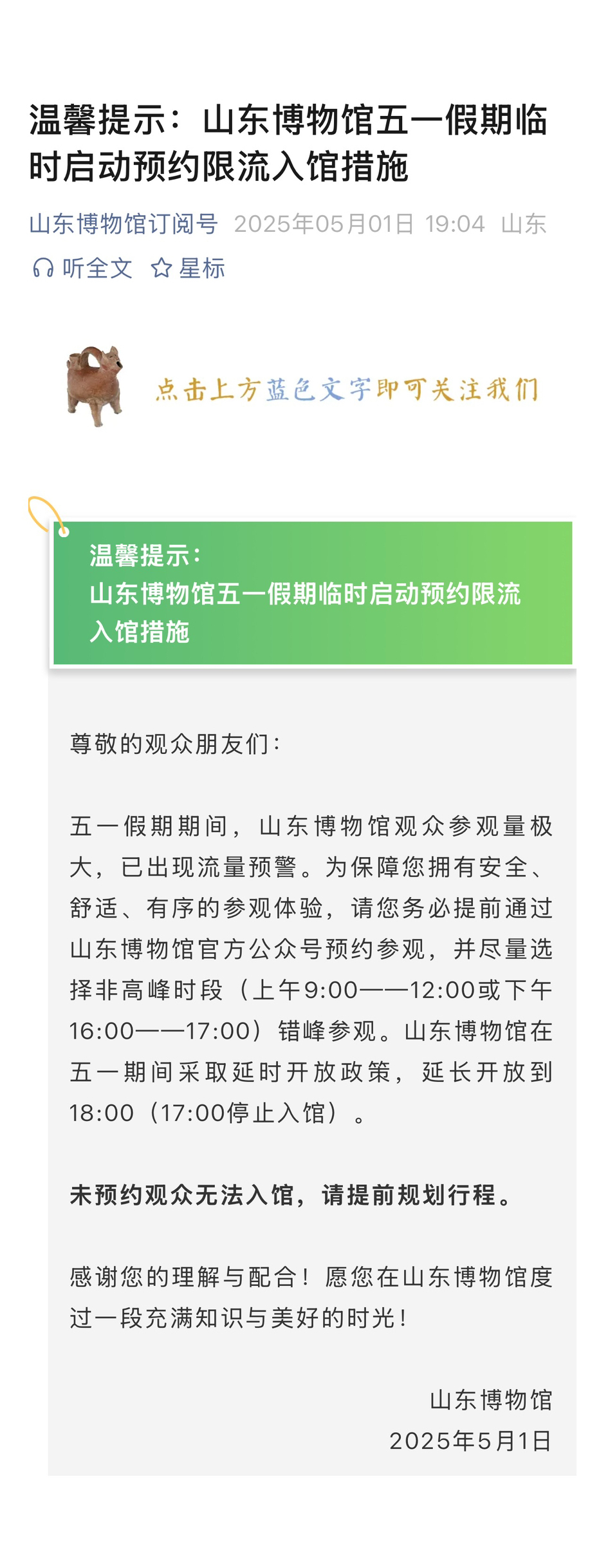 五一假期首日,山东博物馆临时启动预约限流入馆措施,提醒游客提前通过山东博物馆官方公众号预约参观,并尽量选择非高峰时段错峰参观。据悉,为最大限度地满足公众参观需求,山东博物馆在“五一”假期中将每天开放时间延长至18:00。
