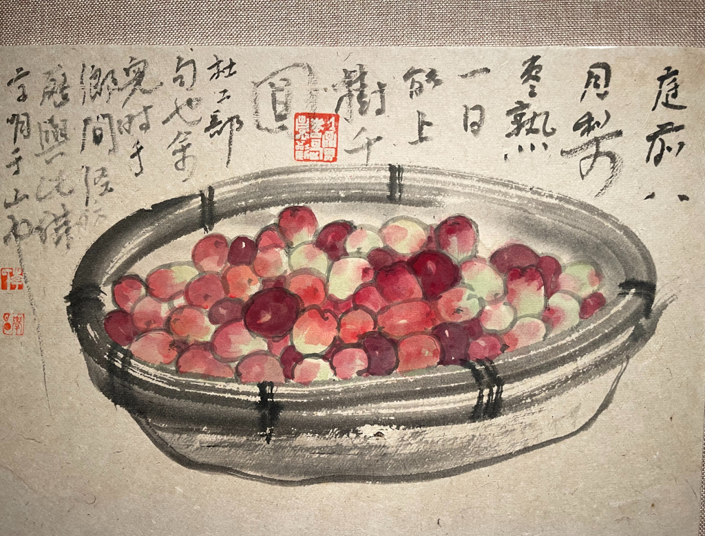 李:前一段时间我画了一个簸箕,里面画了一筐枣,我们那个村子枣树很多,家里也有枣树,每年打枣,那个打枣的过程太兴奋了,画完打枣以后,我感觉非常幸福。我有老乡,他有同感,他说我们家也有一个枣杆子,我看了你画的,眼眶都有泪,思乡,现在那些枣树早没了,都不存在了。