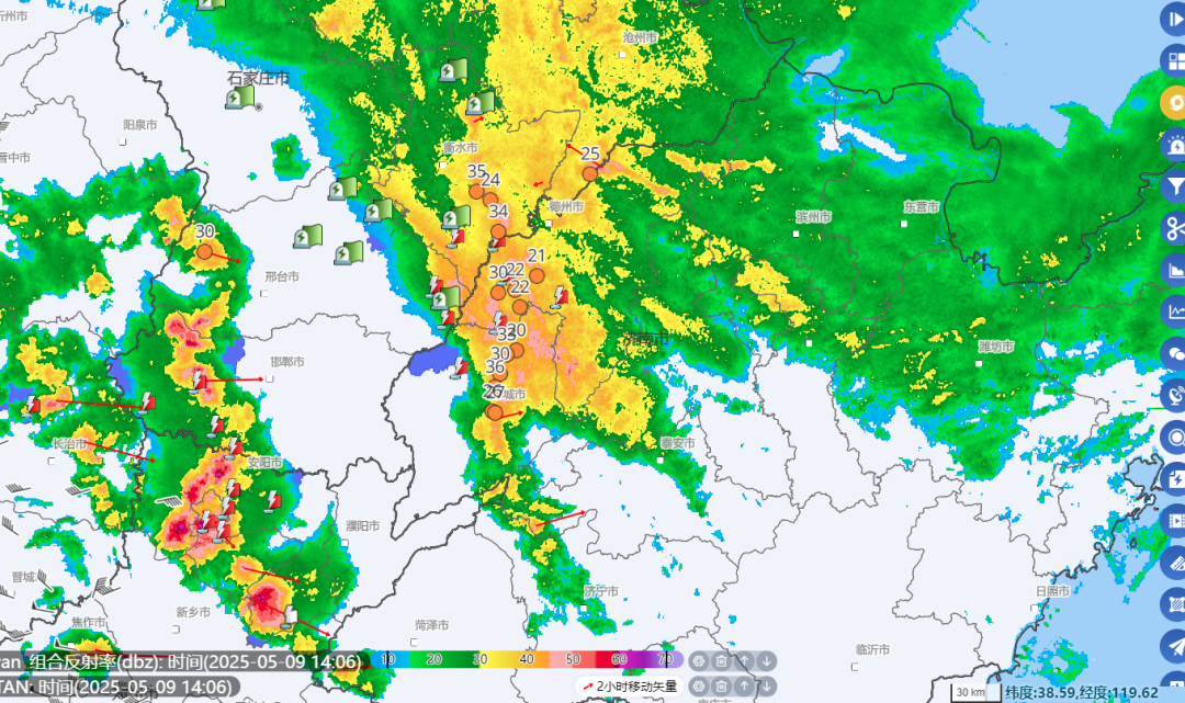 5月9日14时,聊城市气象台发布降水报告。5月9日10时至14时,全市平均、第二降水点茌平肖庄54.2毫米、第三降水点临清金郝庄50.9毫米。降水统计:暴雨3站、大雨15站、中雨36站、小雨78站。各县(市、区)平均降水量:城区18.9毫米、度假区16.1毫米、高新区6.7毫米、开发区18.9毫米、东昌府区13.1毫米、临清22.2毫米、冠县8.1毫米、阳谷4.9毫米、莘县3.4毫米、高唐19.1毫米、茌平25毫米、东阿2.9毫米。预计今天下午到夜间聊城市阴有小雨到中雨并伴有雷电,局部有小冰雹,北风3~4级增大到4~5级、阵风6~7级,雷雨时阵风8~10级局部11级以上。