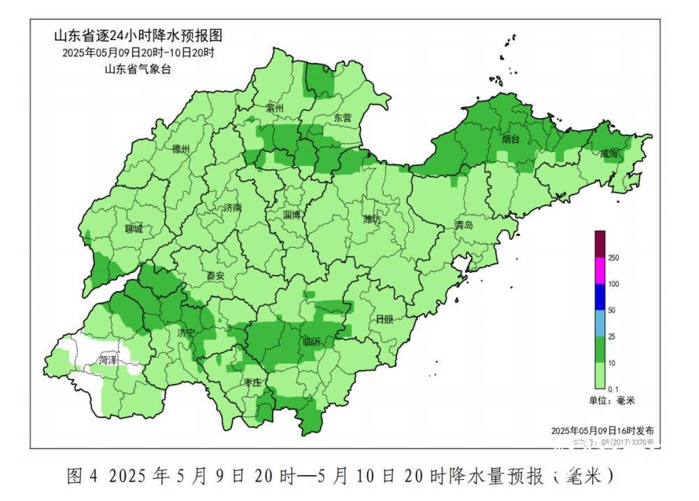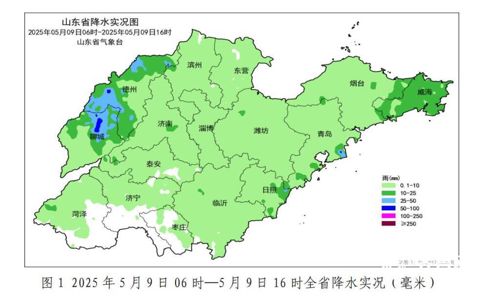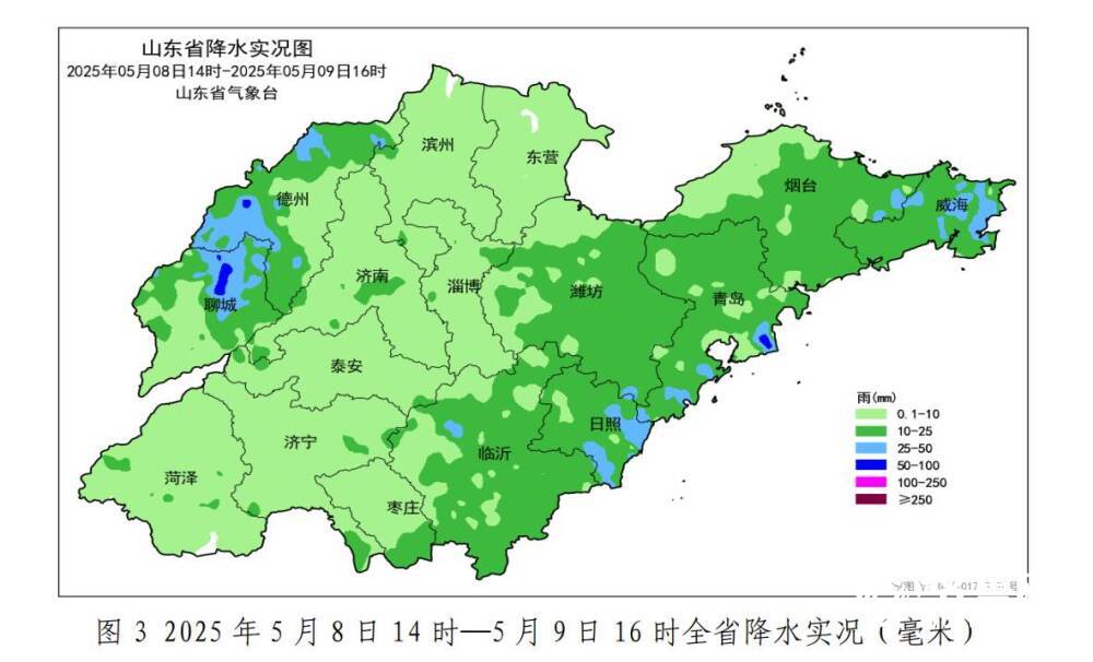 5月8日14时至9日16时,全省普遍出现降水,平均降水量10.3,折合水量约16.2亿方。各市平均:威海20.2、日照18.8、德州15.9、聊城15.8、青岛15.1、临沂12.4、 潍坊11.9、烟台11.0、枣庄7.8、济南7.1、淄博6.5、泰安4.9、济宁4.8、滨州3.9、菏泽3.1和东营1.6。县(区市)平均降水量超过25.0的5个,10.0—25.0的46个,5.0—10.0 的41个,前3位的是:聊城茌平33.1、聊城高唐29.4和德州夏津28.8。所有站点超过50.0的有10个站,25.0—50.0的109个,10.0—25.0的774个,降水量前3位的是:青岛崂山北九水99.4、青岛崂山巨峰索道73.4和聊城茌平杨官屯65.5。