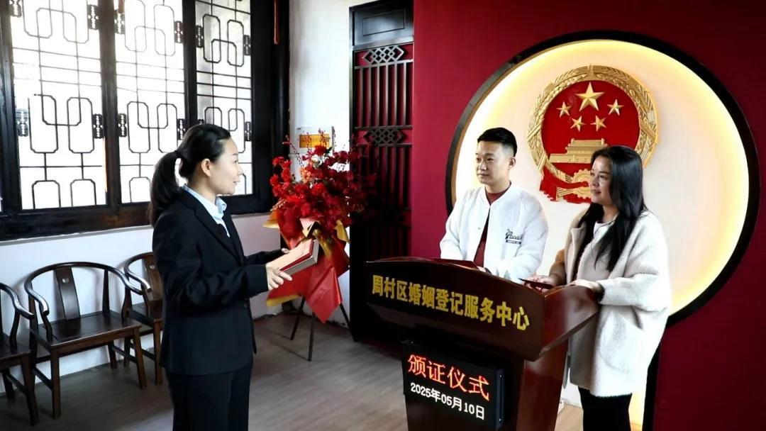 2025年5月10日,新修订《婚姻登记条例》正式落地实施。此次改革以“全国通办”打破地域壁垒、“取消户口簿”简化办事流程、“家庭服务升级”优化服务体验三大创新举措,打造更加便捷、温馨的婚姻登记新范式。今天上午,来自黑龙江的崔先生与宁夏的杨女士携手步入淄博市周村区婚姻登记服务中心,顺利领取结婚证,成为新条例实施后的全省首对省外户籍仅凭身份证办理结婚登记的领证新人。