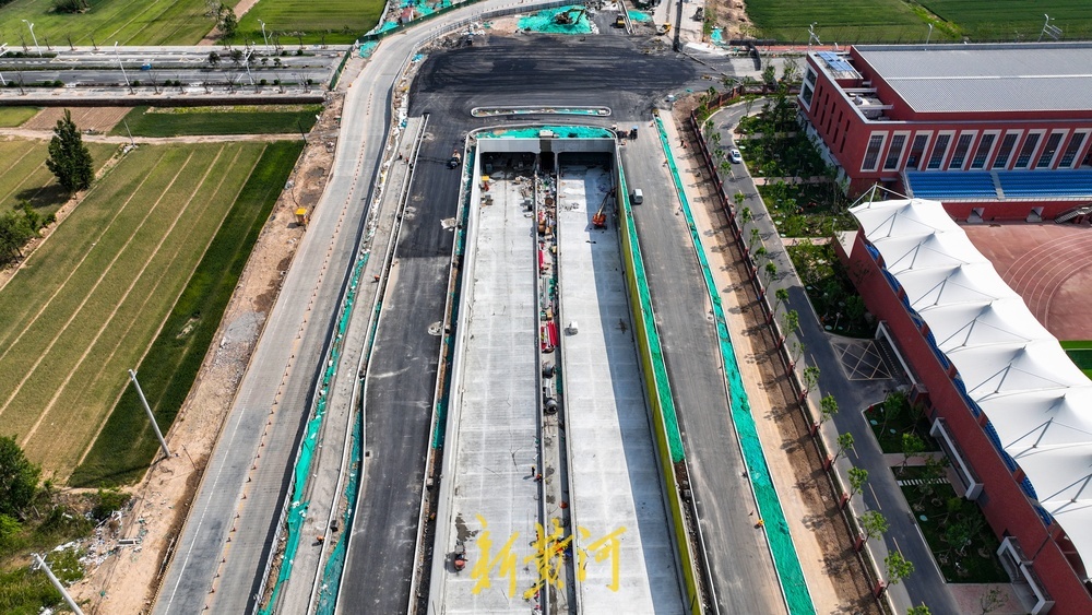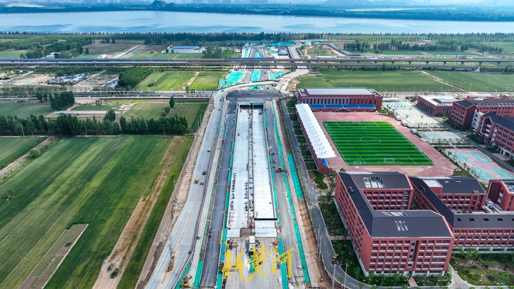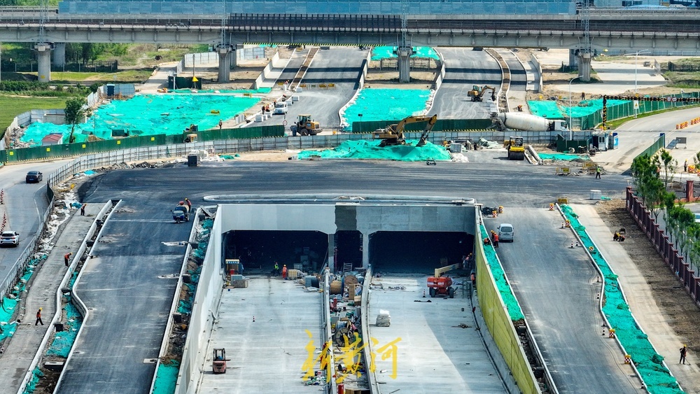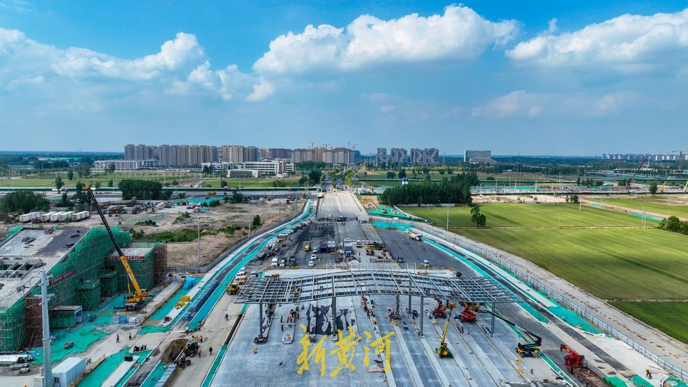 近日,记者在济南黄河北岸的济泺路穿黄北延隧道施工现场看到,位于鹊山水库北侧的穿黄隧道北端出入口已经初具规模,双向地面道路部分区域硬化后铺设了沥青层,临近G308国道的收费站钢架结构正在加速搭建中,目前已经可以看出结构轮廓和大体样式。