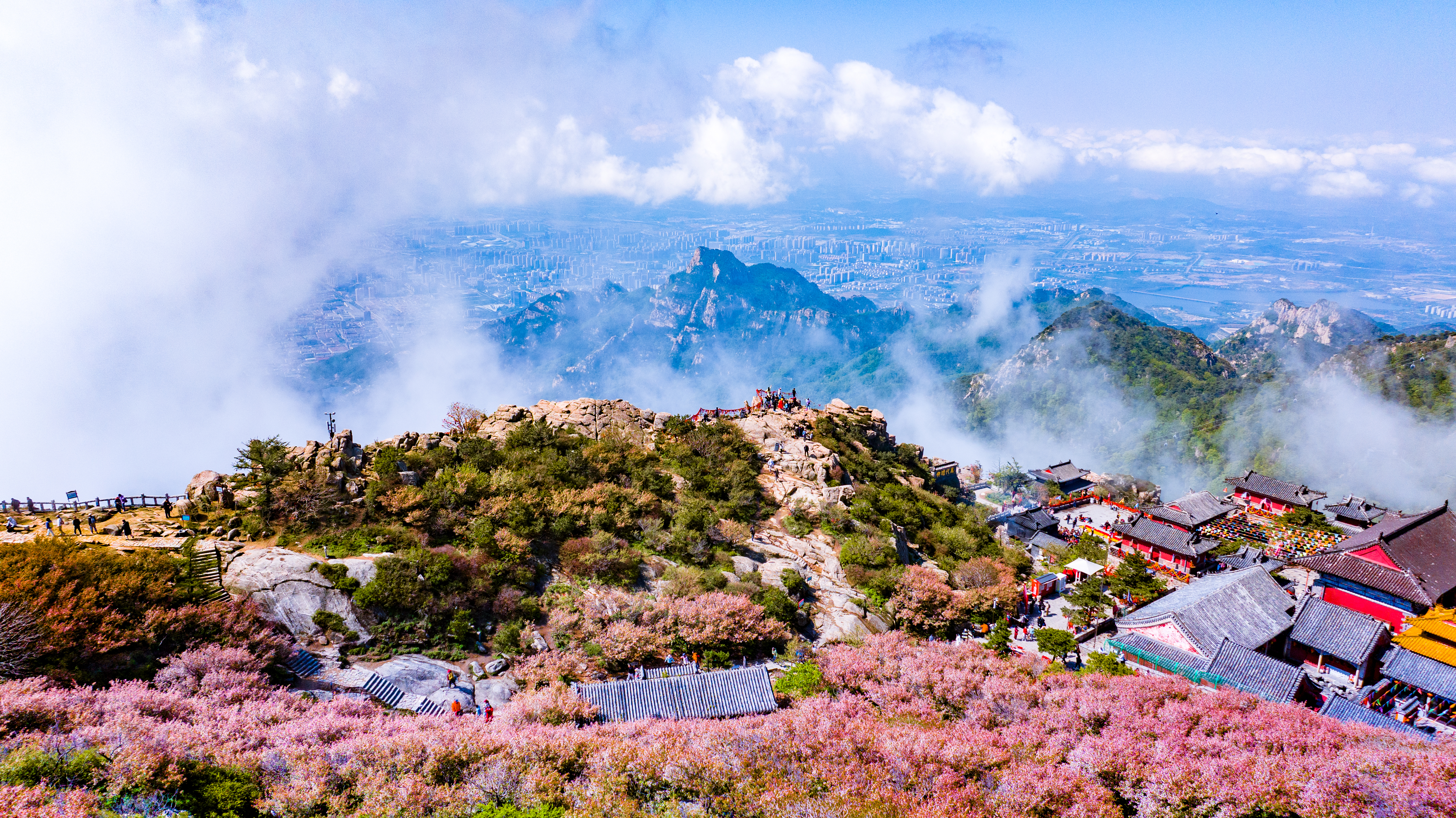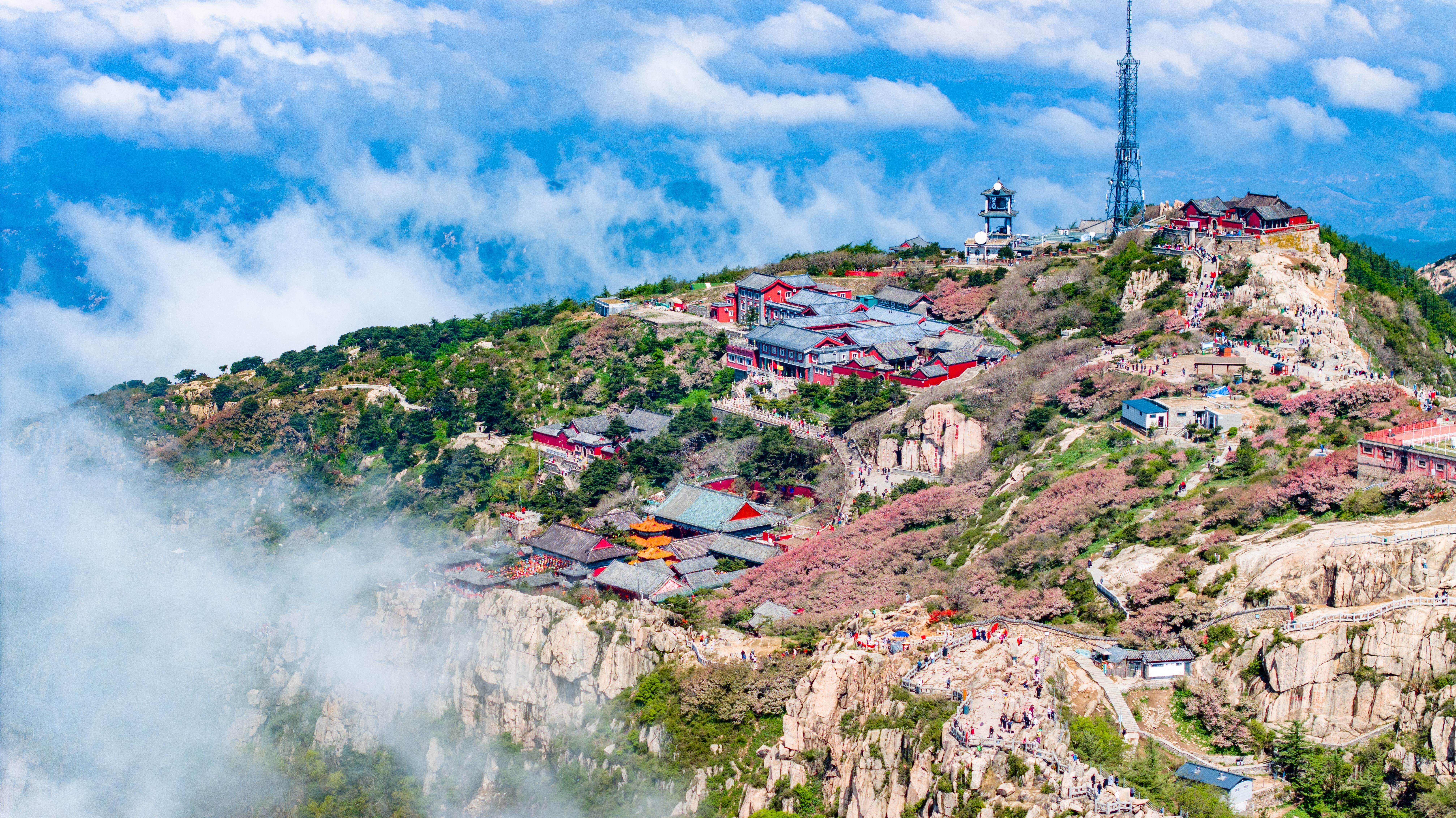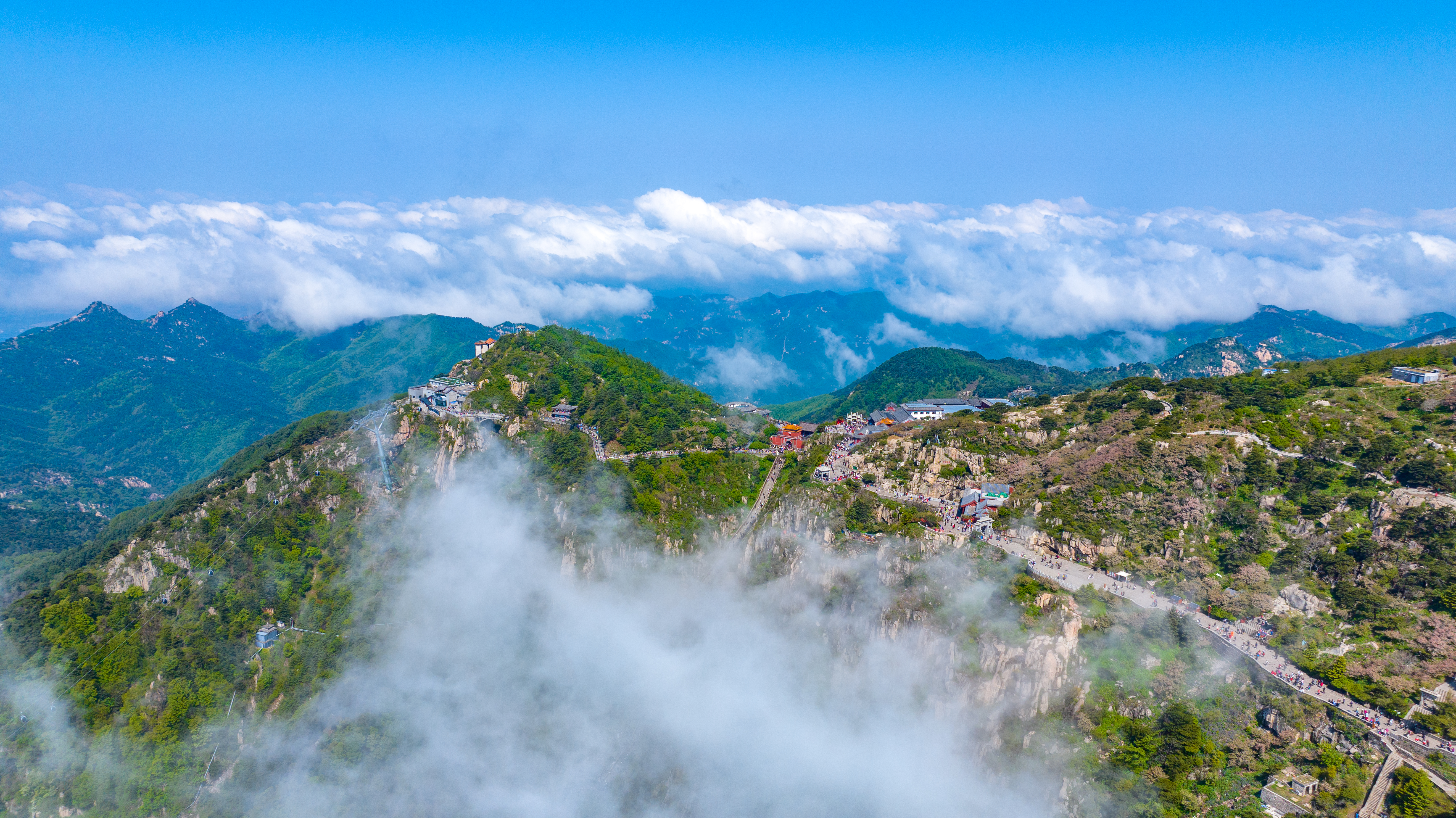 5月10日,降雨过后的泰山之巅,云海翻涌,海棠花海与朵朵白云相映生辉,构成“花在云中开,人在画中游”的绝美画卷。