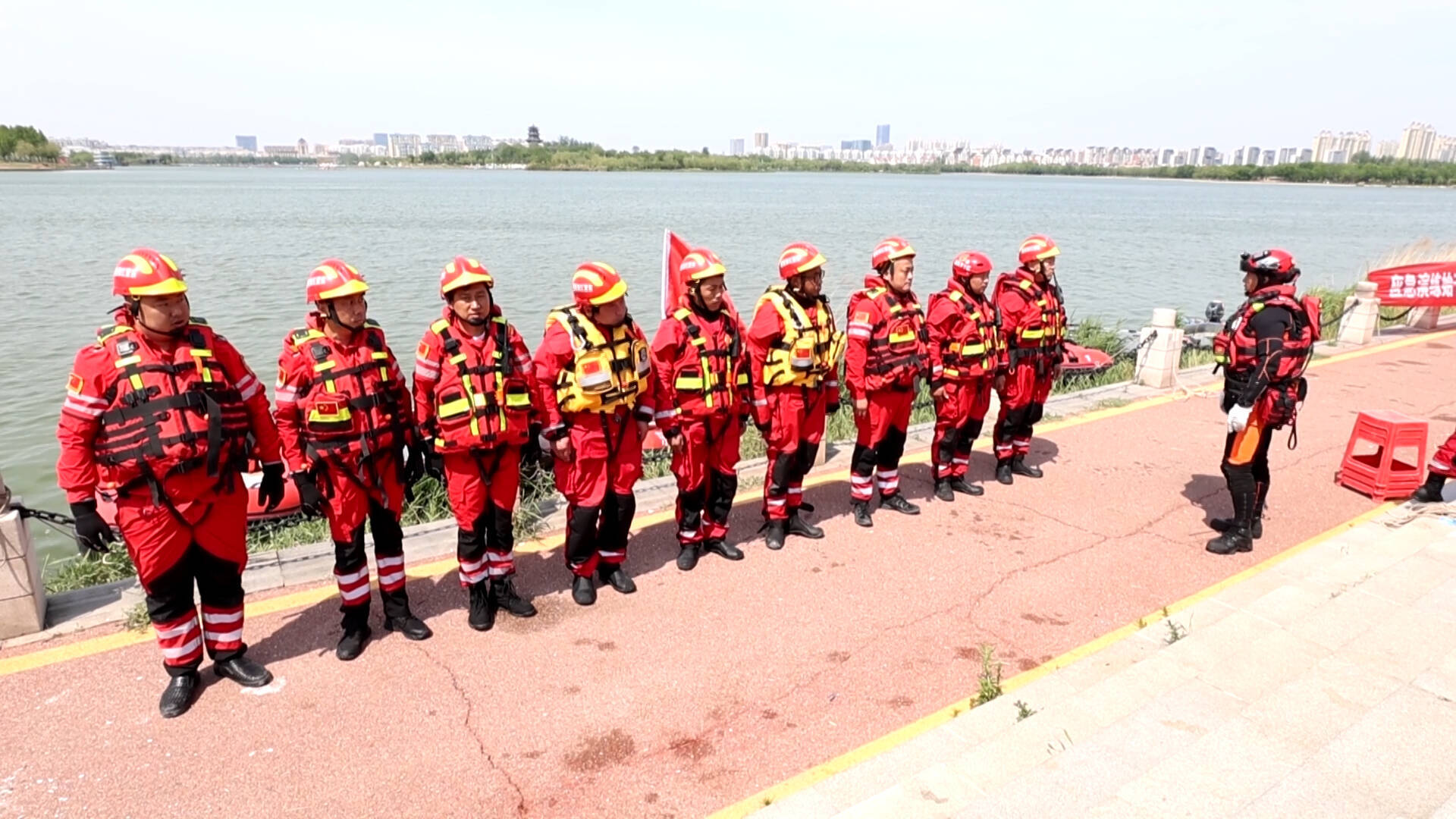 演练模拟东营区遭遇强降雨,水位持续升高,被困群众不慎落水,红十字水上救援志愿者接到求助后迅速出动冲锋舟、无动力救援艇对落水人员进行快速搜救,采用专业水上救援方式将落水者救到岸边进行救治,并向在场人员讲解救援过程和注意事项,提高市民识别险情、紧急避险、遇险逃生、自护自救、抢救溺水人员的能力,保障市民生命财产安全。
