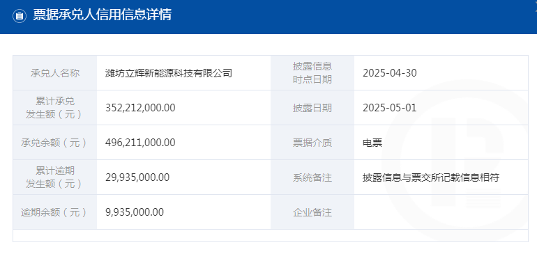 上海票据交易所官网“信息披露平台”栏目中的票据承兑人信用信息详情显示,潍坊立辉新能源科技有限公司累计承兑发生额352,212,000.00元,承兑余额496,211,000.00元,累计逾期发生额29,935,000.00元,逾期余额9,935,000.00元。