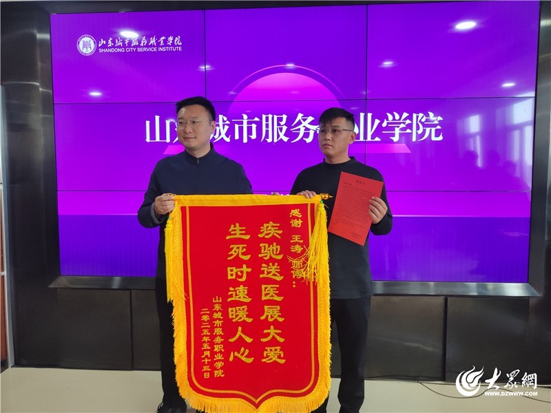山东城市服务职业学院向见义勇为的网约车司机王涛赠送锦旗