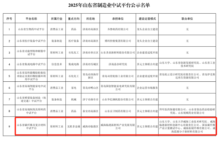 近日,山东省工业和信息化厅公示了一批2025年山东省制造业中试平台名单,全省仅9个平台入选,由威海临港新材料产业发展有限公司承担,山东大学、山东大学威海工业技术研究院、威海临港新材料创新中心有限责任公司、国家碳纤维产业计量测试中心、威海拓展纤维有限公司、威海晨源分子新材料有限公司等多元主体联合共建的山东省碳纤维及复合材料中试平台入选,是威海市唯一入选的平台。