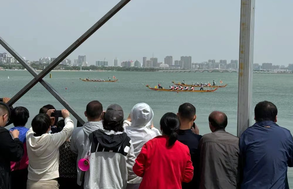岸边的观赛人群里三层外三层,欢呼声、助威声此起彼伏,有的踮起脚尖翘首张望,不愿错过任何一个精彩瞬间。