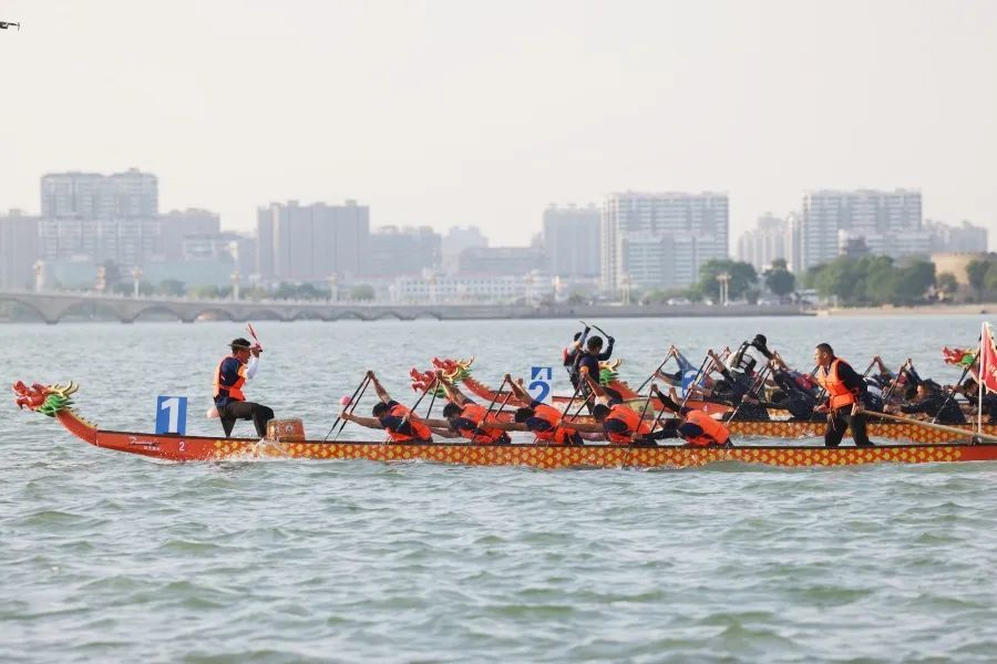 随着发令枪响,东昌湖瞬间化作激烈的竞技战场。鼓声如雷,呐喊震天,一艘艘龙舟如离弦之箭破水而出,选手们身着色彩鲜艳的队服,在舵手激昂的鼓点节奏下,整齐划一地挥桨破水。