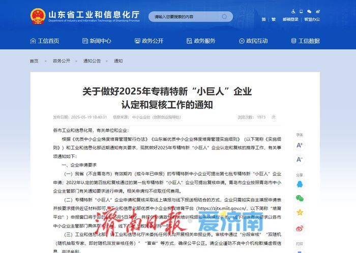 5月19日,山东省工业和信息化厅发布通知,根据《优质中小企业梯度培育管理暂行办法》《山东省优质中小企业梯度培育管理实施细则》(以下简称《实施细则》)和工业和信息化部近期通知有关要求,启动2025年专精特新“小巨人”企业认定和复核的推荐工作。