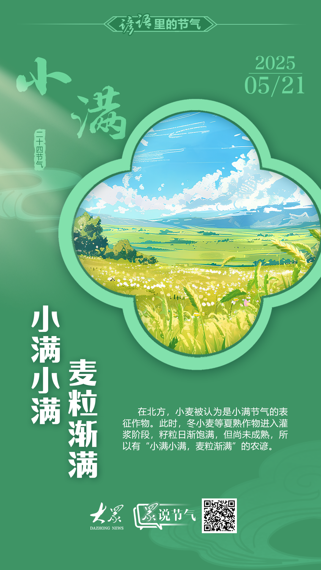 小满翩翩而至,意味着炎热开始登场。在北方,小麦被认为是小满节气的表征作物。此时,麦田里黄绿交接,冬小麦等夏熟作物进入灌浆阶段,籽粒日渐饱满,但尚未成熟,每一颗都好像在为丰产准备着最后的冲刺,所以有“小满小满,麦粒渐满”的农谚。
