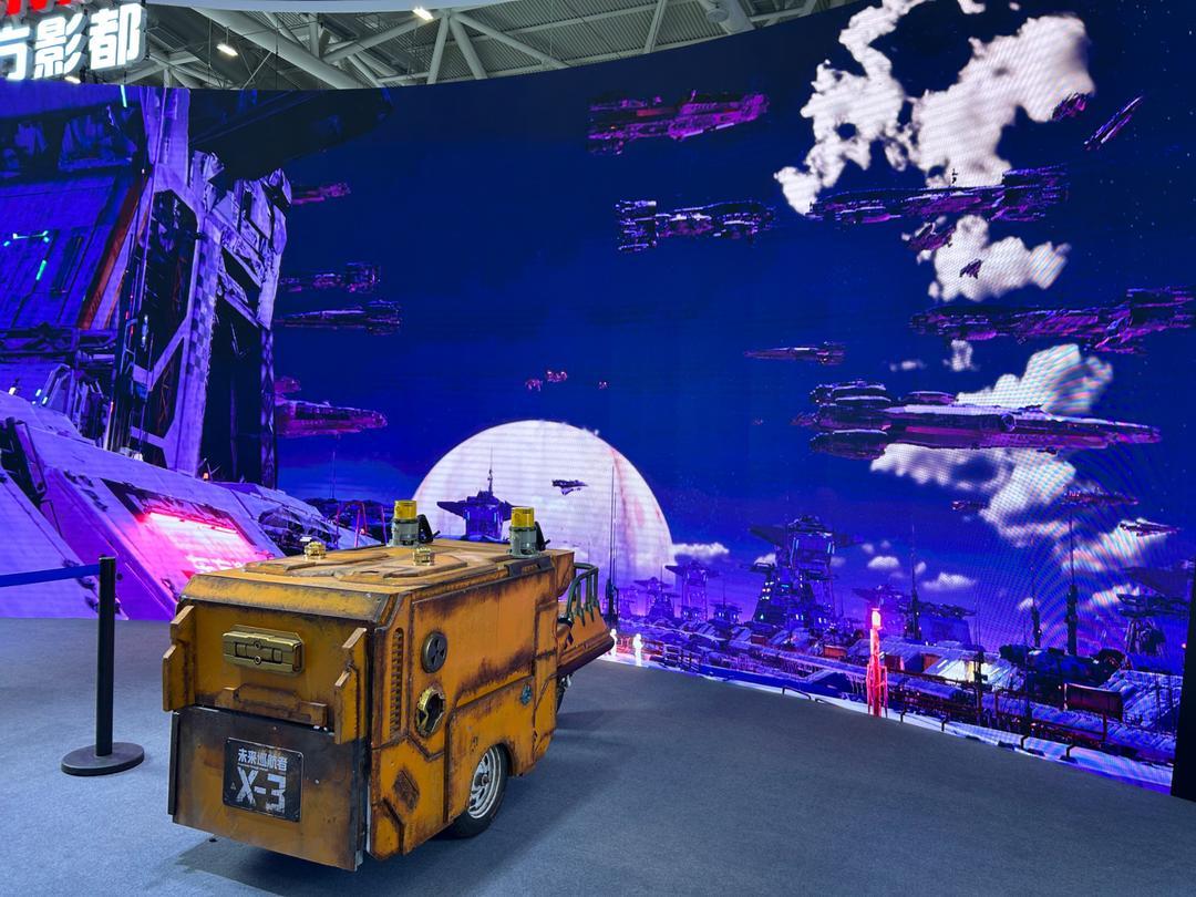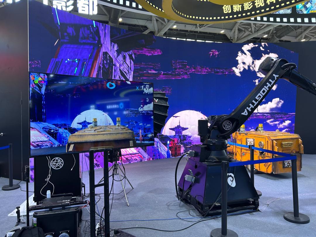 在青岛东方影都设置的“虚拟影棚”:一块大屏播放科幻电影经典场景,一条机械臂驱使数字摄像机,一块小屏实时显示人在景中的画面。克苏鲁影视科技(青岛)有限公司总经理孟君韬告诉记者,“电影实际拍摄场地更复杂、设备更精密。在文博会现场,我们通过这三个元素的组合,简单明了地向观众展示——未来的电影该如何拍摄。这也是电影工业化发展的趋势。”