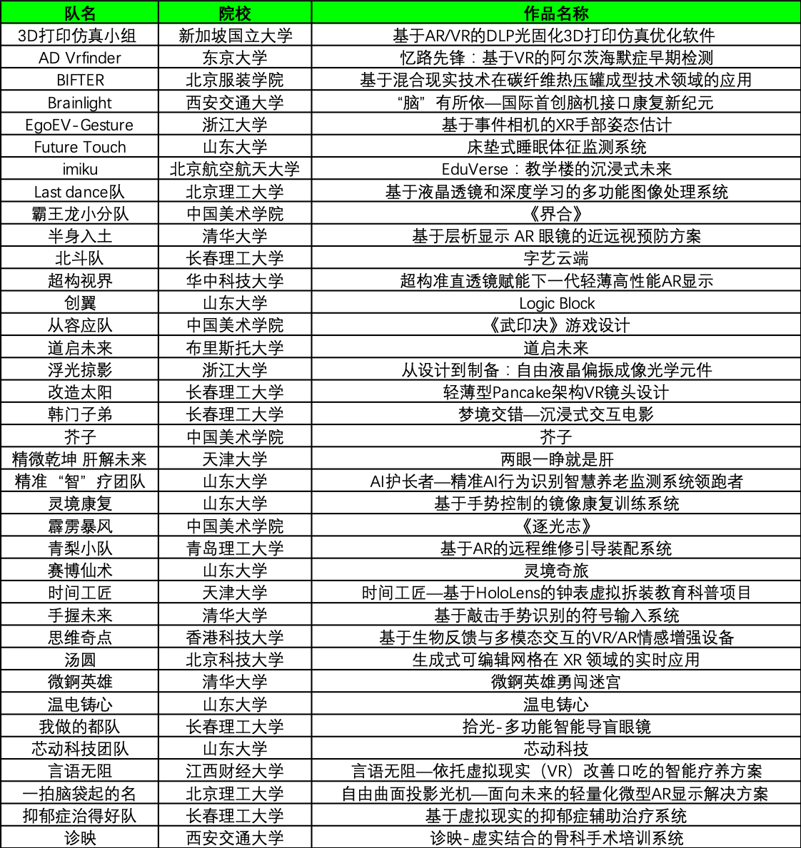 从半决赛参赛作品内容上看,VR/AR应用作品数量进一步提升,涉及工业、教育、医疗、文旅、游戏等多个领域,应用范围更加广泛。相当一部分作品尝试打通硬件性能、交互逻辑与内容适配性,凸显参赛队伍从单点突破转向系统性生态构建的前瞻思维,也从侧面体现出行业对软硬件协同发展与内容生态建设的重视。而在硬件关键技术如光学等方面,半决赛已涌现出多个优质关键技术创新方案,并与企业前沿技术应用方向高度契合,展现出高校在VR/AR领域澎湃的创新动力。