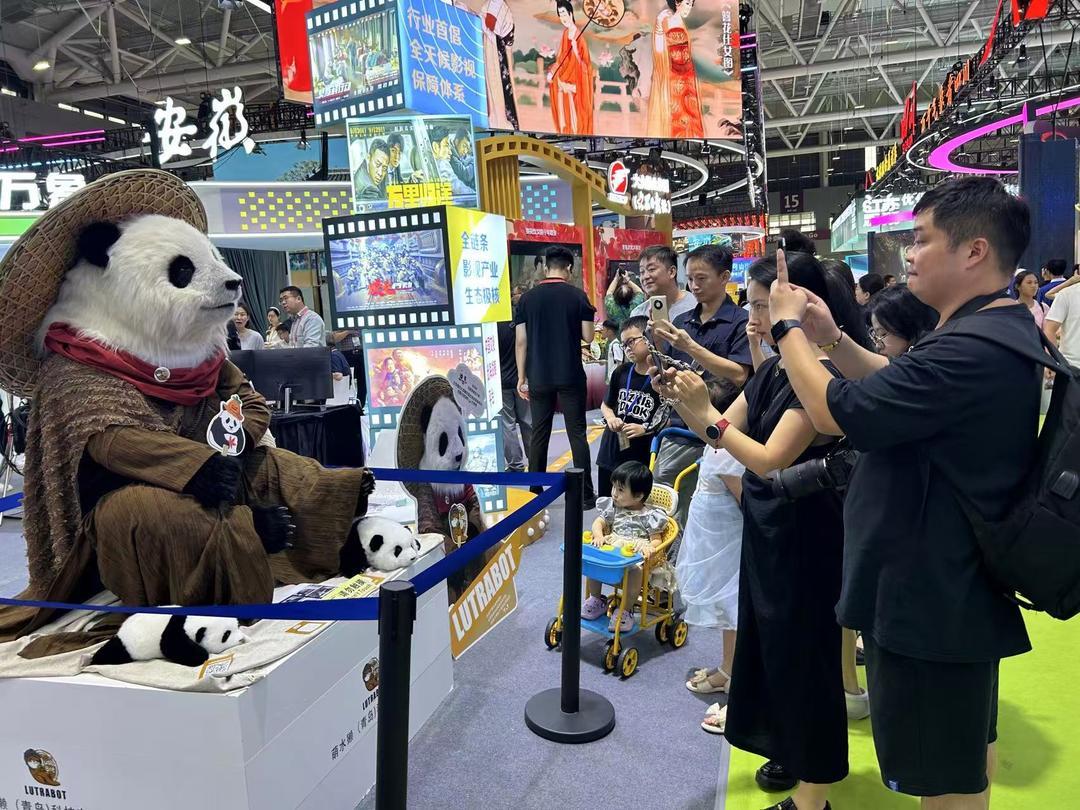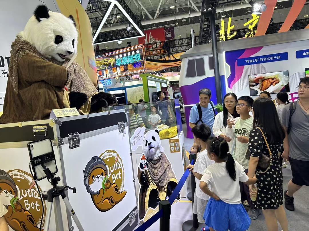 萌水獭科技在山东展区展示机器仿生熊猫,能即时捕捉人的面部动作,做出各种趣味表情,引来观众围观体验。