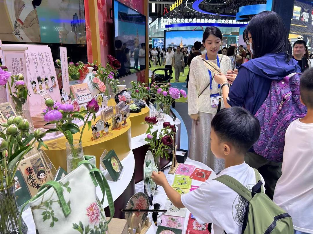 山东展区入口处,芍药鲜切花阵阵香气氤氲,菏泽牡丹系列文创发散无穷魅力。