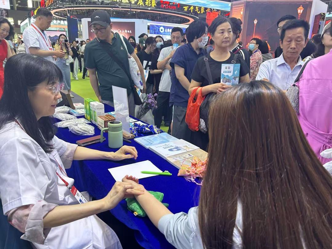 山东中医药大学附属医院、山东省中医院教授滕晶,“坐镇”山东展区,现场展示省级非遗“扁鹊脉学诊法”。现场队伍排成了“长龙”,其中不乏年轻人。