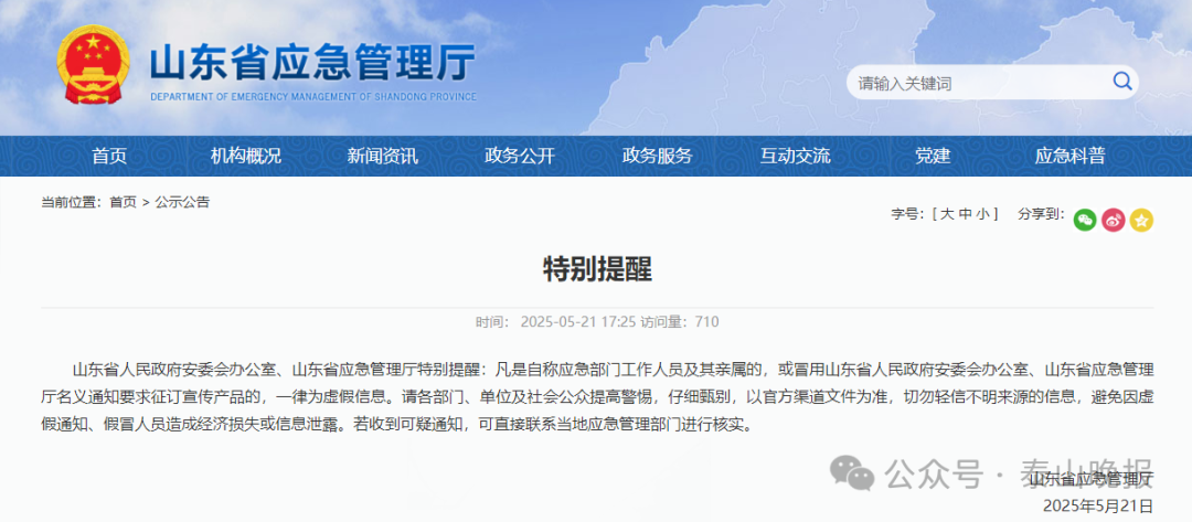 山东省人民政府安委会办公室、山东省应急管理厅特别提醒:凡是自称应急部门工作人员及其亲属的,或冒用山东省人民政府安委会办公室、山东省应急管理厅名义通知要求征订宣传产品的,一律为虚假信息。请各部门、单位及社会公众提高警惕,仔细甄别,以官方渠道文件为准,切勿轻信不明来源的信息,避免因虚假通知、假冒人员造成经济损失或信息泄露。若收到可疑通知,可直接联系当地应急管理部门进行核实。