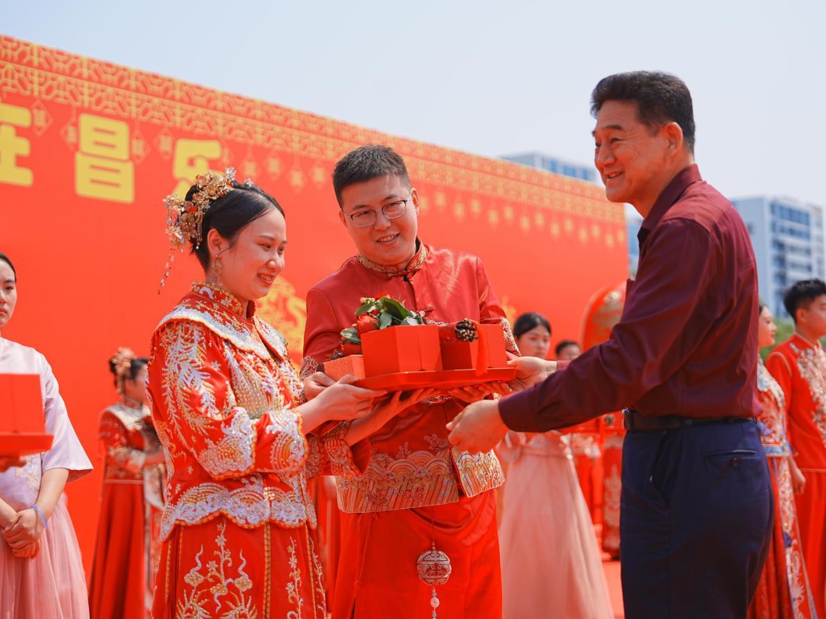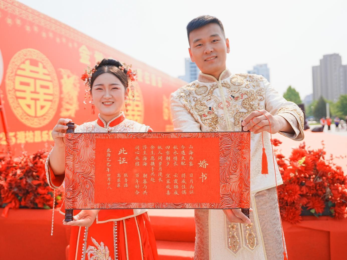 婚礼流程融合传统与现代元素,新人们依次完成合卺酒、结发礼、执手礼等仪式,随后身着定制婚服巡游打卡,活动特别准备的“简婚大礼包”涵盖婚服、新娘妆、福彩刮刮乐鲜花束等,既减轻经济负担,又增添趣味性。 民政局部门表示,此次活动通过“婚戒+婚书”的匠心设计,将非遗技艺与婚俗改革结合,为移风易俗注入文化内涵。梦金园以企业担当助力公益,既弘扬传统文化,又为新人留下珍贵纪念。