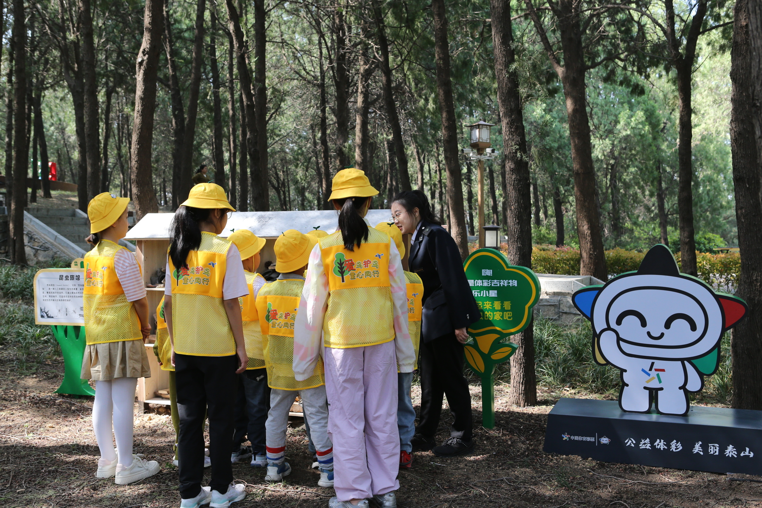 虎山自然科普教育基地以“乐小星”命名。乐小星是中国体育彩票的吉祥物,它以活泼可爱的形象,为整个自然科普教育基地注入了幸运与活力。乐小星虎山自然科普教育基地傍山而建,北望雄伟泰山,南观虎山瑶池,山水相映其中,景色秀丽如画,一经建成就已成为市民、青少年亲近自然、探索自然的热门“打卡地”。公众畅游在自然科普基地,可以观看12个以“树叶、小鸟、花草”为造型的鸟类户外科普装置,上面详细介绍了各种鸟类名称、特点、习性;也可以通过40副专业鸟类摄影作品,近距离观赏海拔1200米以上的隼形目和雀形目鸟儿翱翔姿态;基地还有一座用数百个木片、竹筒松果搭建而成的“昆虫旅馆”,这个昆虫的小家能够帮助它们度过酷暑严寒......大自然是最好的课堂,基地的建成,也为青少年走进泰山打开了自然之门,在自然教育的广阔天地里,通过研学、户外、观鸟、科普讲堂等形式,青少年可以在大自然中培养科普认知,进行自然探索与科学探究,让他们亲手触摸、亲眼见证、亲身体验自然的奥秘。