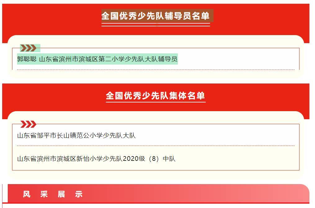 近日,共青团中央、教育部、全国少工委作出表彰决定,授予张天天等437人全国优秀少先队辅导员荣誉称号,授予北京市西城区康乐里小学少先队大队等590个集体全国优秀少先队集体荣誉称号。其中,滨州1人、2个集体获得荣誉称号。