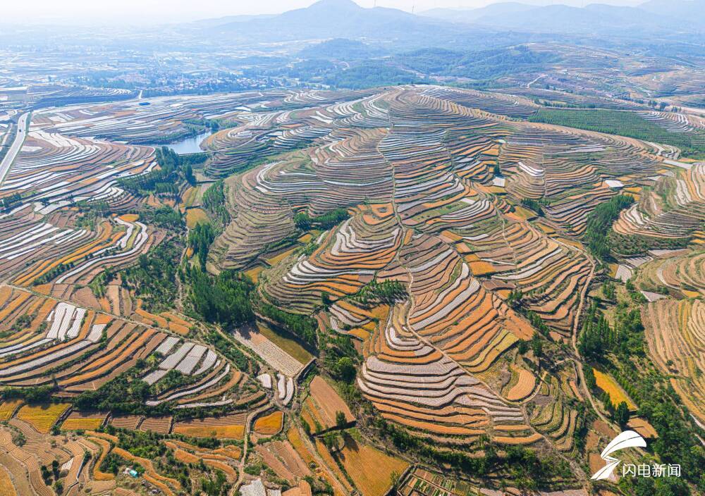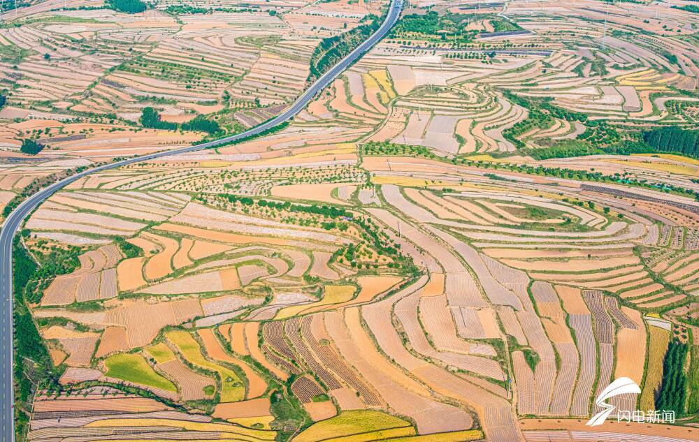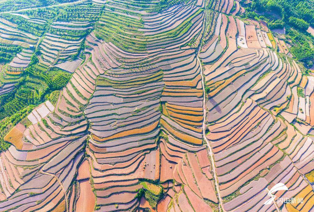 齐鲁网·闪电新闻5月27日讯 初夏时节,日照市五莲县的万亩梯田美不胜收。从高空俯瞰,层层叠叠的田垄间,农民在辛勤劳作,阳光洒落下,呈现出斑斓的色彩。蜿蜒的梯田与道路、村舍、蓝天白云等交相辉映,构成一幅人与自然和谐共生的生态画卷。