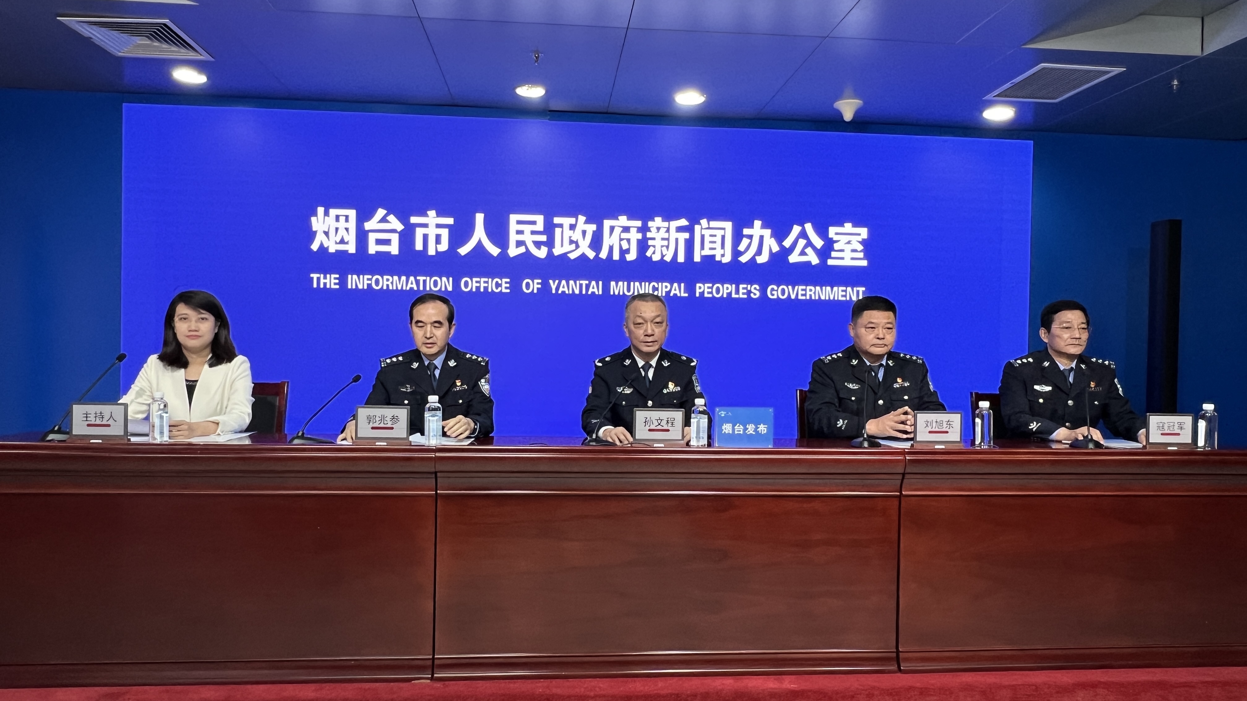 5月30日,烟台市政府新闻办召开全市公安机关助力提振消费护航绿色低碳高质量发展新闻发布会。烟台市公安局党委委员、副局长、指挥中心主任孙文程,烟台市公安局经济犯罪侦查支队政委刘旭东,烟台市公安局交通警察支队副支队长郭兆参,烟台市公安局治安警察支队副支队长寇冠军出席发布会并回答记者提问。