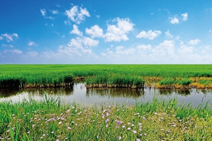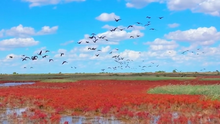 向新向绿向未来。渤海之滨,风机迎风转动、光伏面板装点成的“蓝色海洋”熠熠生辉,释放出无尽的“绿色能量”。光伏矩阵、湿地飞鸟、落日长河,共同晕染成新时代齐鲁大地的“千里江山图”。