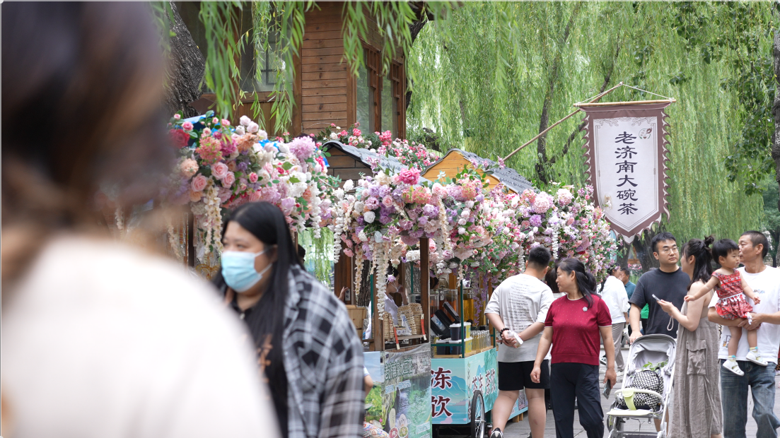 环城公园以“泉水+公益+烟火气”为特色,打造花团锦簇、琳琅满目的赏花市集,文创好物琳琅满目,匠人手作彰显匠心。最具老济南风情的当属泉水大碗茶,甘甜的黑虎泉活水现沏香茶,搭配特色茶点,游客沿河而坐,看泉眼汩汩,沐河畔清风,沉浸式体验泉城烟火气。
