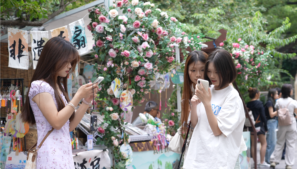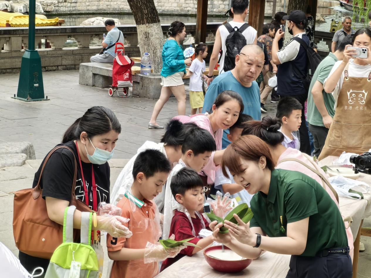 湖畔的民俗文化市集则是非遗爱好者的天堂:翻花、剪纸、面塑、漆扇等传统技艺现场展演,指尖翻转间,千年文脉与端午民俗娓娓道来,带领市民游客邂逅非遗盛宴。金典有机龙舟节展区成为游客尤其是小朋友的热门之选,各种趣味互动游戏融合诗词文化与传统民俗,带来初夏里的欢乐体验。