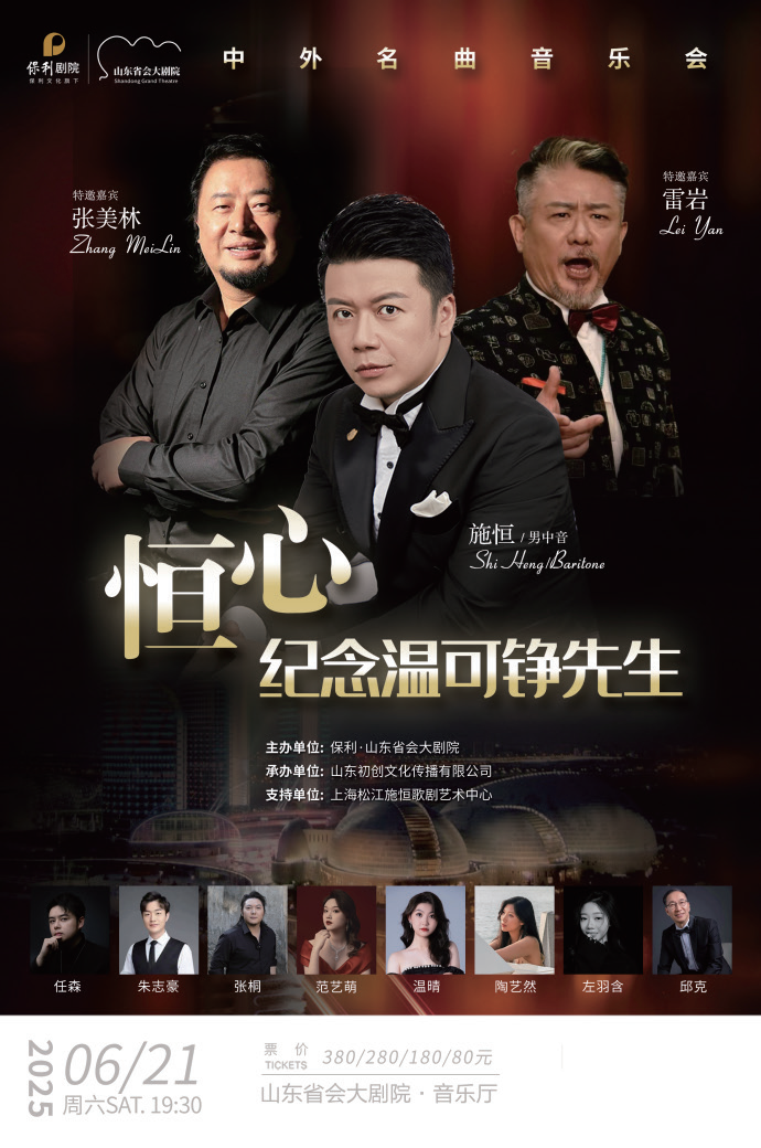 演出介绍:本场纪念音乐会是为了回顾和追思温可铮先生所举办。将由多为知名歌唱家,献上经典曲目,给观众带来不同凡响的听觉享受。演唱者们用精湛的声乐技巧和充沛的情感,让观众沉浸在中外名曲的独特魅力之中。从古典诗词改编的歌曲到著名歌剧选段,再到经典流行音乐,不同风格的作品相互交织,展现极高的艺术水准。