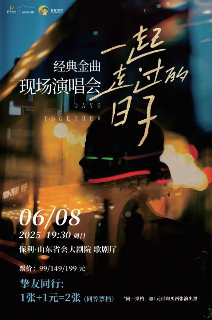 演出介绍:重温岁月鎏金,聆听时代回响!《一起走过的日子》经典金曲演唱会诚意集结华语乐坛黄金年代的永恒旋律,以匠心编曲和顶级现场乐队,全新演绎跨越数十年的动人乐章。实力唱将倾情献声,沉浸式舞台设计搭配复古视觉特效,带领观众穿越流金岁月。