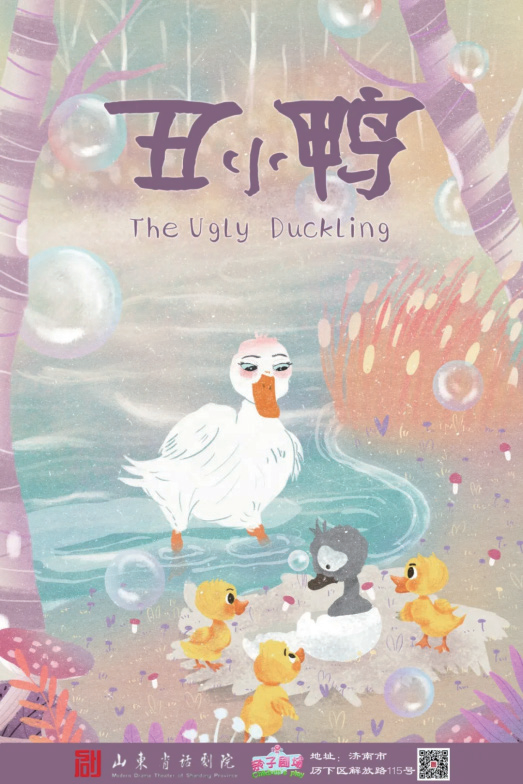演出介绍:在很久很久以前,农场里美丽的鸭妈妈孵化出一只奇丑无比的“小鸭子”,姐姐们给他取名叫——丑小鸭。农场的邻居们因此而嘲笑鸭妈妈,鸭祖爷爷甚至连证明他是只鸭子的“鸭族标志”都没有给丑小鸭。丑小鸭不忍心看到妈妈再为他伤心难过,于是决定离开农场,去寻找属于自己的生活……