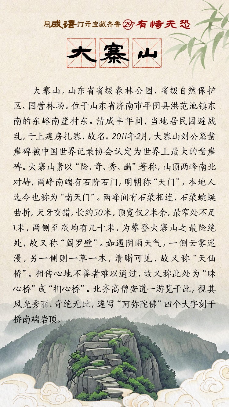 大众网·海报新闻推出《用成语打开宝藏齐鲁》栏目,采用AIGC技术生成妙趣图文,带你穿越千年,探寻宝藏齐鲁的名人轶事、历史典故、地域美景以及传统文化。
