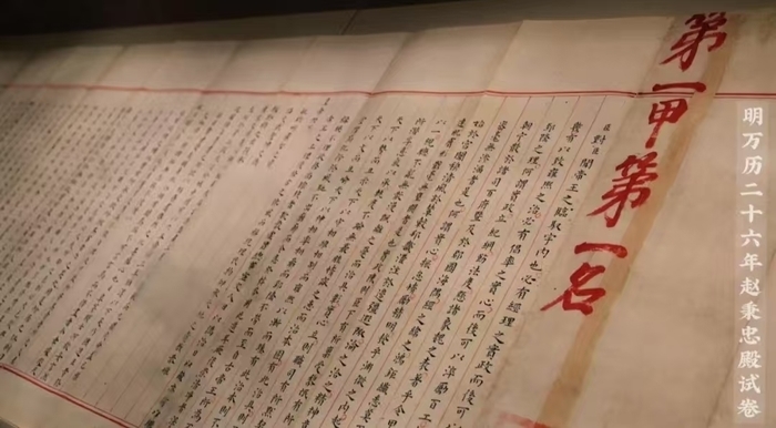 人气最旺的,莫过于青州博物馆的“镇馆之宝”——明朝状元试卷。这份明万历二十六年状元赵秉忠的殿试卷是国家一级文物,全长268厘米、高47.6厘米,共2460字,均用一厘米见方的馆阁体小楷写成,每个字大小一致,无一误笔,引得网友纷纷点赞。5月31日—6月2日端午假日期间,不少即将考试的考生和家长前来“沾喜气”,博物馆1000人预约每天都达到满额。