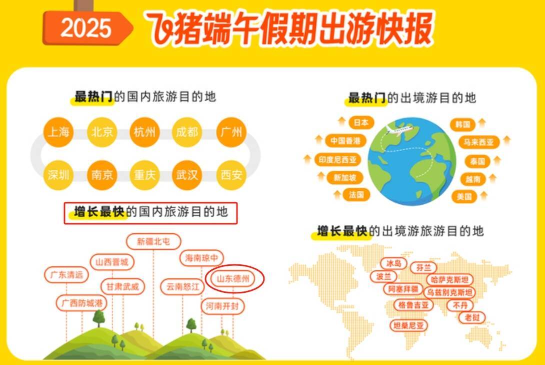 具体来看,目的地方面,上海、北京、杭州、成都、广州、深圳、南京、重庆、西安、武汉是今年端午期间国内最热门的旅行目的地。新疆北屯、山西晋城、海南琼中、广东清远、甘肃武威、云南怒江、山东德州、广西防城港、河南开封的旅游预订人次增速领跑全国。