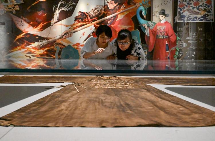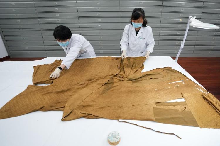 在苏州丝绸博物馆修复室内,两位工作人员在整理明代四合如意云纹缎褡护(5月18日摄)。新华社记者 李博 摄
