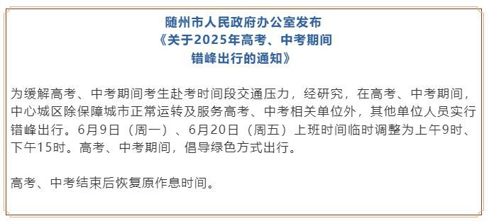 3日,湖北省随州市人民政府办公室发布通知,在高考、中考期间,中心城区除保障城市正常运转及服务高考、中考相关单位外,其他单位人员实行错峰出行。6月9日(周一)、6月20日(周五)上班时间临时调整为上午9时、下午15时。高考、中考期间,倡导绿色方式出行。高考、中考结束后恢复原作息时间。