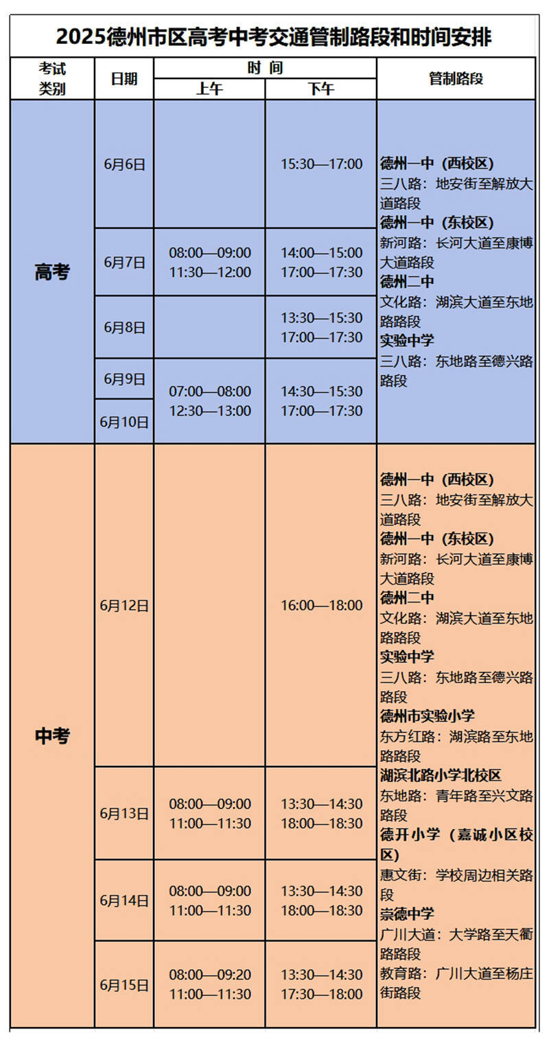 中高考期间,通往德州市区各考点的部分路段将采取临时交通管制措施。管制期间,禁止非考务车辆在管制时间内驶入管制路段。车辆行经考点周边道路要减速慢行,禁止鸣笛、违法载人、违法停车。