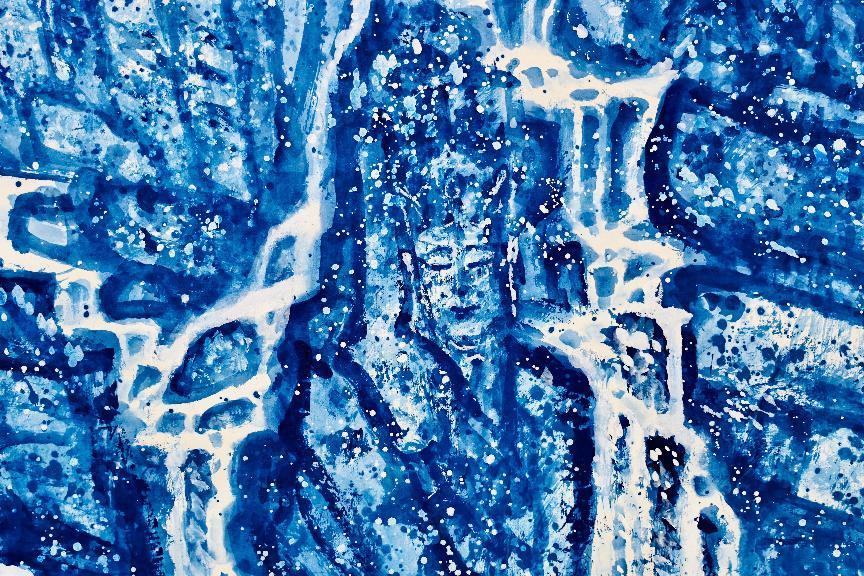 生态艺术家何帅臻先生以十七载艺术坚守,以东方水墨为语言,以地球生态为核心,构建起独特的“艺术+生态”叙事体系。其作品突破传统山水框架,以深邃的“蓝调”贯穿创作,将物种多样性、生命庄严与人类心灵生态巧妙相融。此次展出的《不让地球母亲泪再流》、《行走的蓝色和平》、《山河大地皆如来》等系列,既是对自然伤痕的沉痛诘问,亦是对“天人合一”东方哲学的当代诠释,让观者在笔墨氤氲中感受生态危机的紧迫与和谐共生的可能。