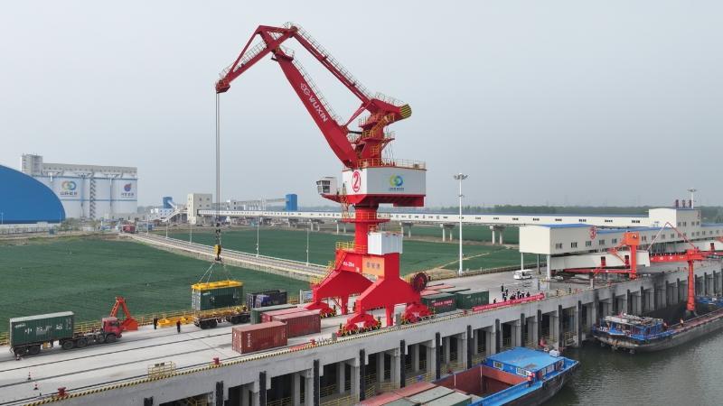 在兖矿泰安陆港,起重机将集装箱吊到货船上。