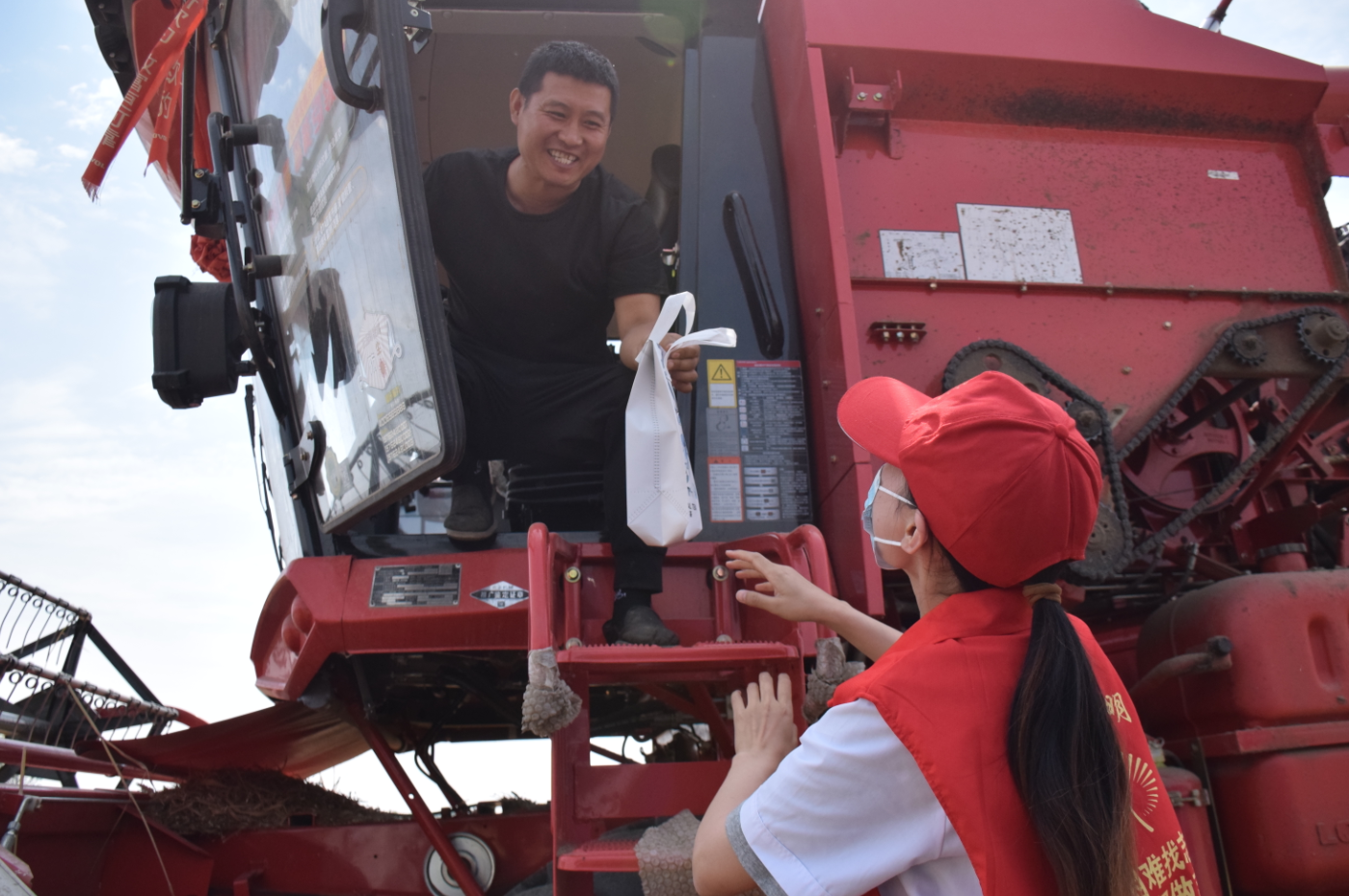 在麦收现场,志愿者们穿梭在田间地头,卫生院志愿者将一杯杯酸梅汤递到农机手手中,并贴心叮嘱防暑注意事项。“喝了酸梅汤,干活更有劲了,我一定把收割机开好,争取把机损降至最低。”一杯消暑的酸梅汤下肚,农机手林东满足地抹掉额头上的汗,立即驾驶农机继续投入到收割工作中。