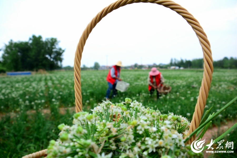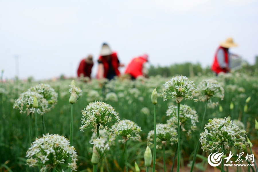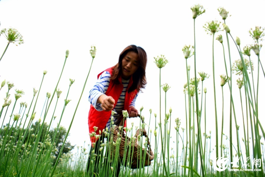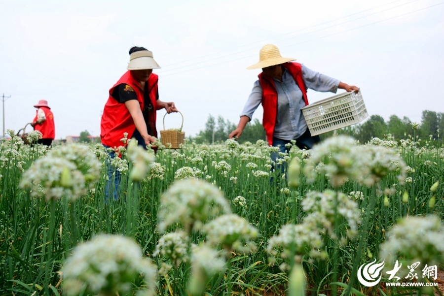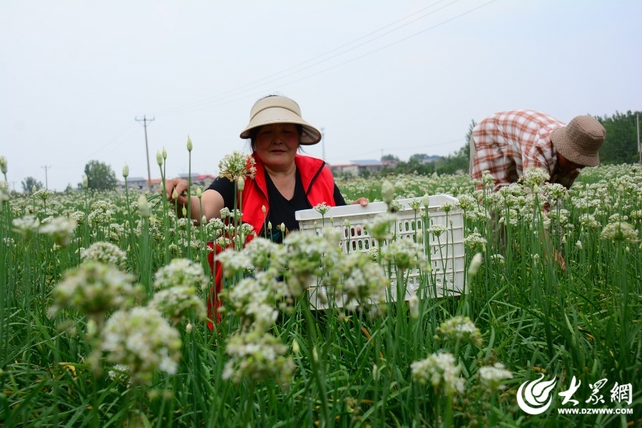近日,临沂市郯城县农民种植合作社种植的“订单”韭菜花迎来开花期。社员及时采摘,田间地头一派忙碌。(通讯员 张乐民)