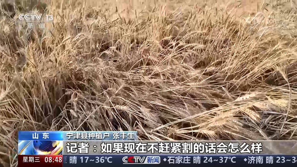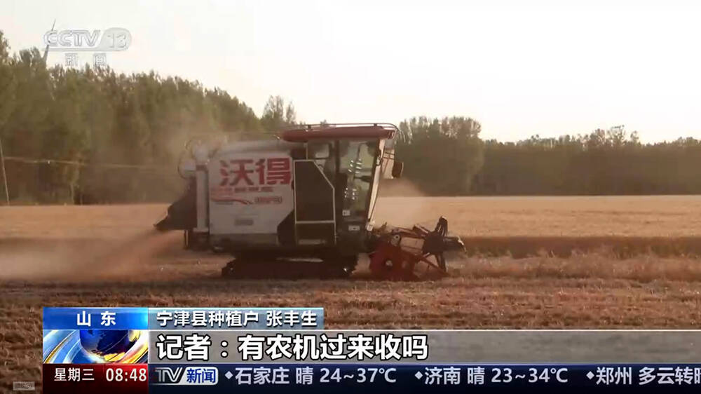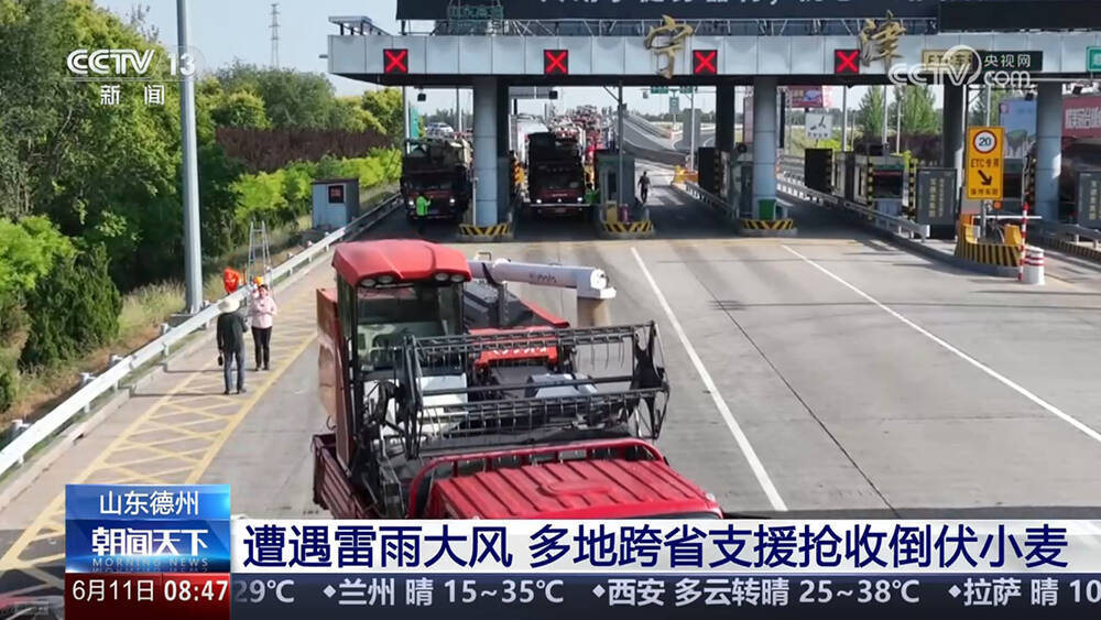 11日,央视【朝闻天下】栏目报道了德州市连夜协调外省,紧急调集履带式收割机,全力抢收因雷雨大风倒伏的小麦的新闻。报道如下: