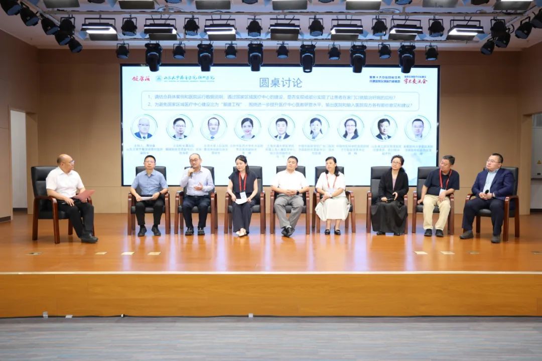 圆桌讨论环节由齐鲁医院德州医院党委委员、副院长费剑春主持。讨论围绕进一步提升医疗中心医教研管水平,输出医院和输入医院双方提出意见和建议。来自北京积水潭医院聊城医院、北京大学人民医院青岛医院、北京中医药大学东方医院枣庄医院、上海交通大学医学院附属上海儿童医学中心临沂医院、中国中医科学院广安门医院济南医院、中国中医科学院西苑医院济宁医院、山东省立医院菏泽医院、首都医科大学宣武医院济南医院等山东省内8家项目医院的领导、专家代表围绕各地实践,提出了有价值、有温度、有操作性的意见建议,形成了思想共识与行动共识。