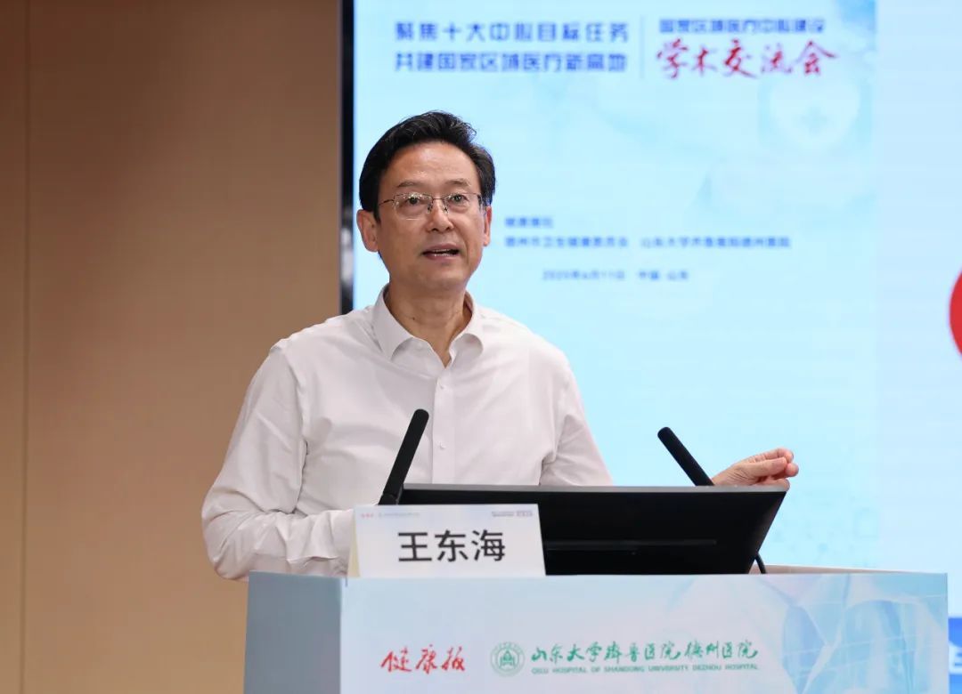 齐鲁医院德州医院党委副书记、院长王东海作《促提升整合赋新能,双中心同质谋发展》主题报告,系统汇报了德州医院在双中心共建背景下,围绕国家区域医疗中心“十大中心”功能定位推进专病诊疗一体化、能力标准一体化、资源使用一体化的探索实践。