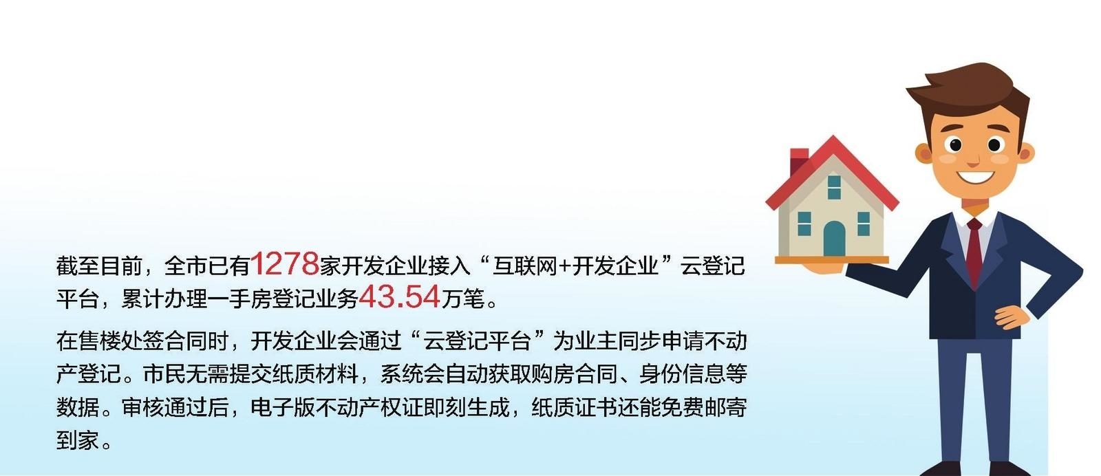 大小新闻客户端6月12日讯(YMG全媒体记者 杨健 通讯员 陈楠)夏季一向是市民办理过户的高峰期。今年,市民买新房办房本,还能继续省心省力。记者昨日从烟台市自然资源和不动产登记中心获悉,烟台不动产登记全面升级“互联网+不动产登记”服务,市民从签合同到拿房本全程“无感办理”。截至目前,全市已有1278家开发企业接入“互联网+开发企业”云登记平台,累计办理一手房登记业务43.54万笔,网办率高达93.69%,真正让群众享受到了“零跑腿”的便捷服务。