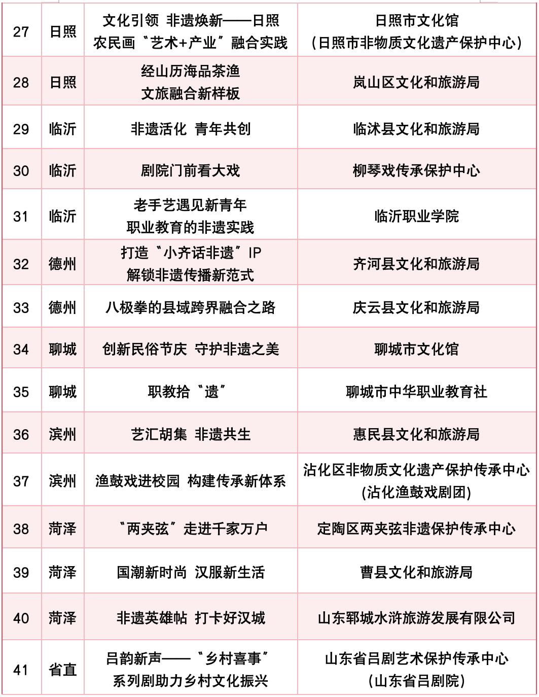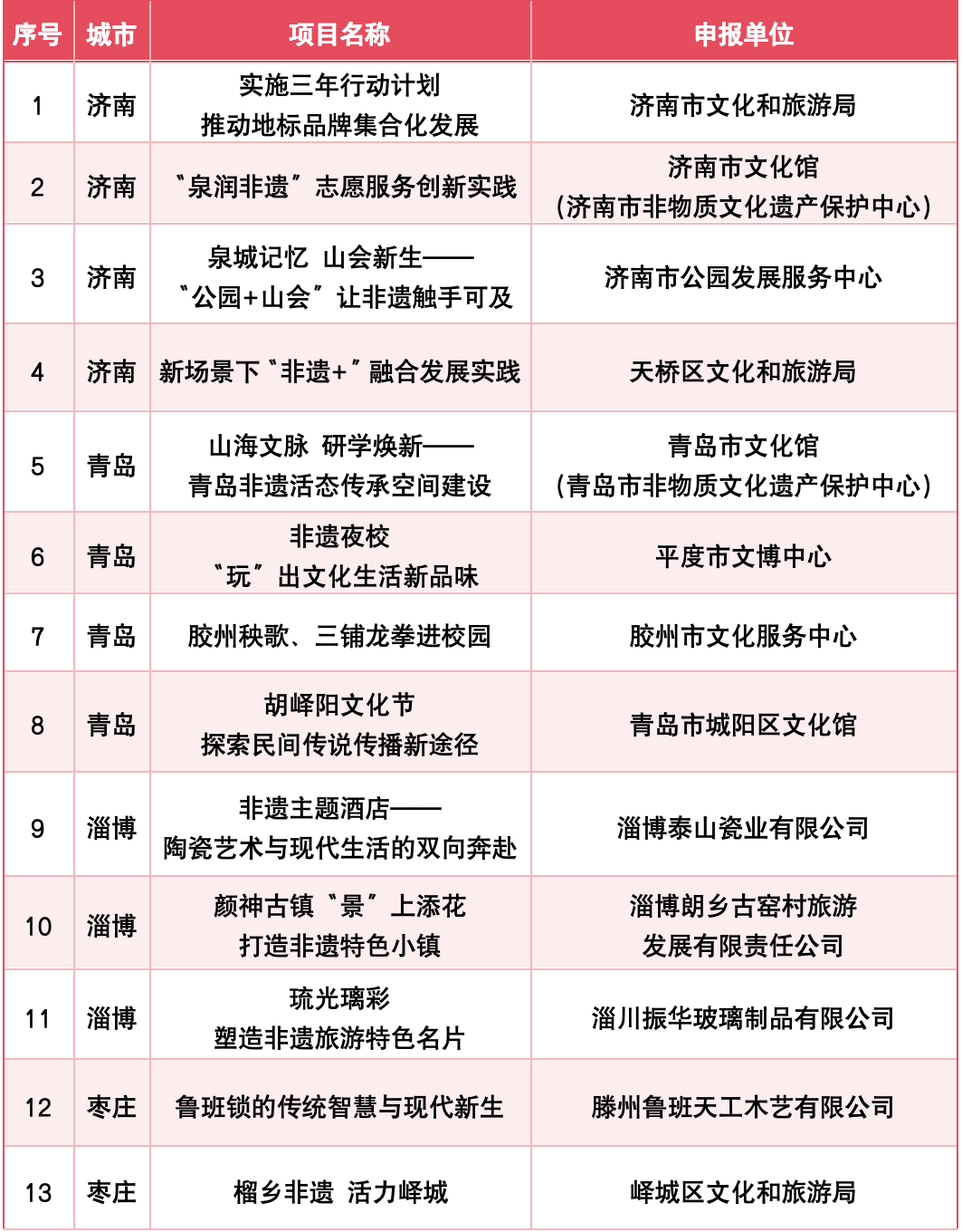 为进一步推动非物质文化遗产的创造性转化、创新性发展,更好融入现代生活,山东省文化和旅游厅组织开展了“非遗融入现代生活”创新实践项目推荐工作。经项目申报、专家推荐等程序,确定了43个山东省“非遗融入现代生活”创新实践项目。