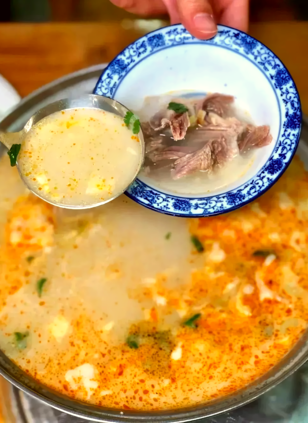 山亭的羊肉汤,奶白醇厚的汤底裹挟着浓郁鲜香,撒上葱花、香菜与胡椒,一口入喉,暖意从胃底蔓延至心间。炖得软烂的羊肉毫无膻味,每一口都是满满的治愈。